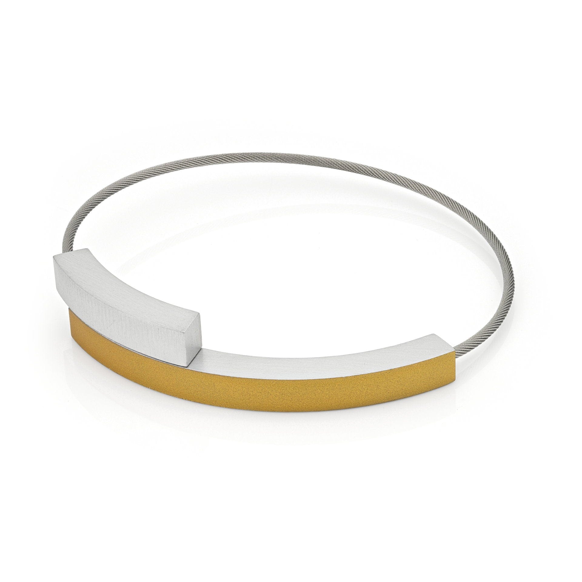 Dieses Armband besteht aus zwei Bögen, die mit einem versteckten Magnetverschluss zusammengehalten werden. Dieses Armband hat einen farbigen und einen silberfarbenen mattierten Teil.